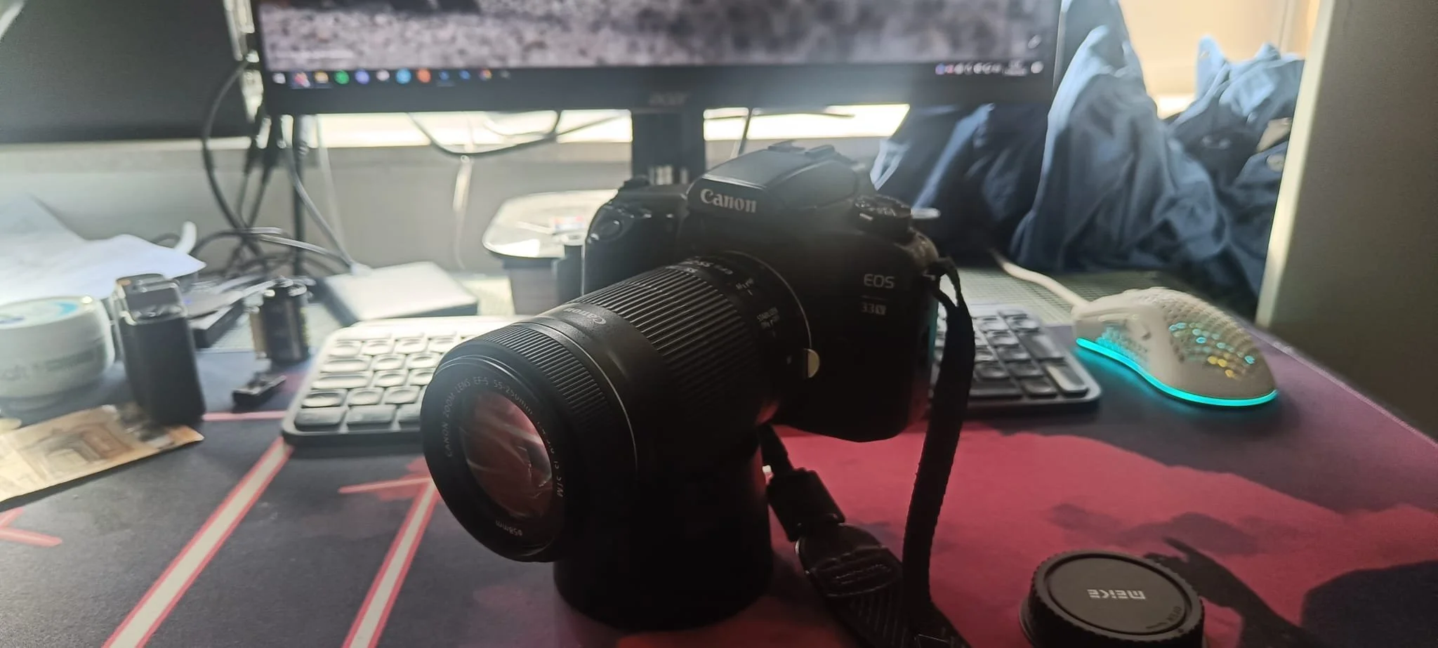 Gesagt getan, ich nahm die Kamera also mitsamt ihrer Tasche, Akkus und Objektiven, einem 18-55mm Kitobjektiv und einem 55-250mm Zoom mit zu mir und begann daran herumzuspielen.