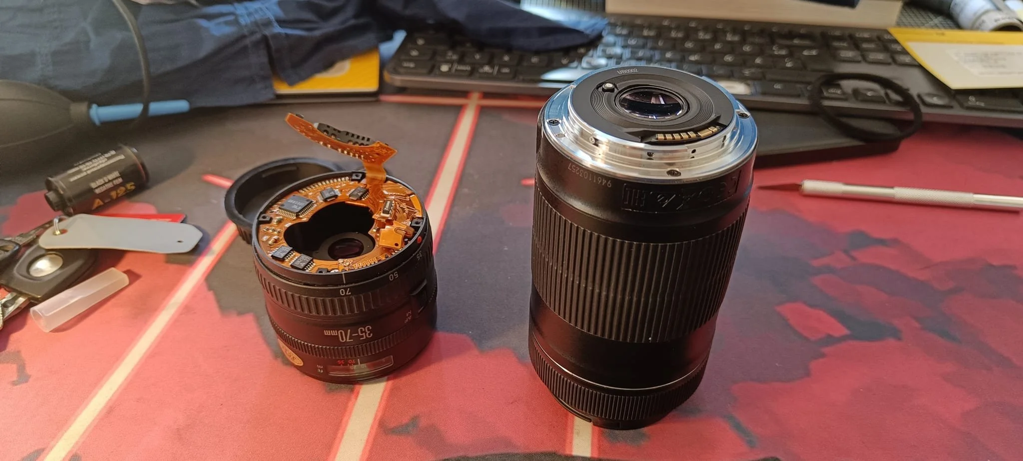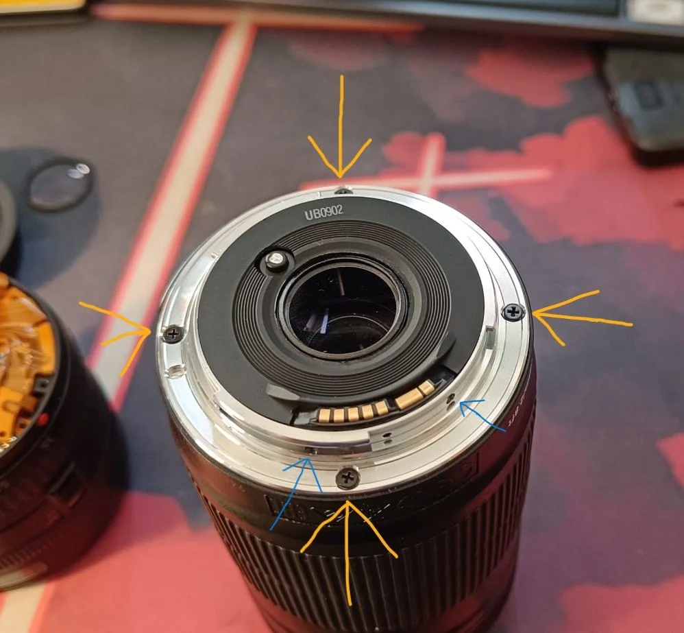 In diesem Fall wurde ein altes und verharztes, 35-70mm Kitobjektiv ausgeschlachtet.Nicht alle EF-S Objektive sind dafür geeignet, auf EF umgerüstet zu werden;